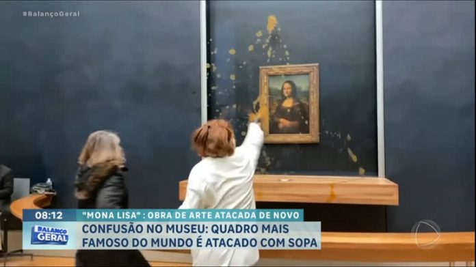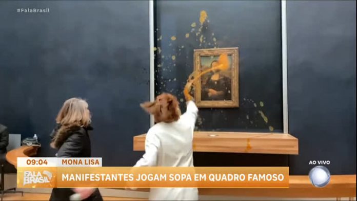 Duas manifestantes atiraram sopa no famoso quadro Mona Lisa, de Leonardo da Vinci, que fica em exposição no Museu do Louvre, em Paris. Elas gritavam e pediam por alimentação saudável e agricultura sustentável durante o ataque. Depois da cena, as mulheres foram para a delegacia.
