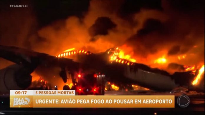 Um avião com 367 passageiros e 12 tripulantes pegou fogo logo após pousar no aeroporto de Haneda, no Japão. Na hora da aterrissagem, aeronave ela bateu em um avião da guarda costeira. Cinco pessoas morreram e apenas o piloto deste avião menor sobreviveu.