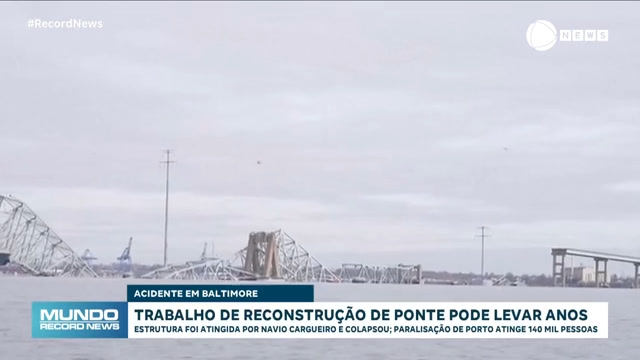 A reconstrução da ponte que desabou após ser atingida por um navio, perto do porto de Baltimore, nos Estados Unidos, deve demorar anos, segundo as autoridades. Os destroços do cargueiro, que ia para o Sri Lanka, começaram a ser removidos nesta semana. O acidente aconteceu na madrugada do dia 26 de março, quando a embarcação teve uma pane elétrica e acabou atingindo a ponte.