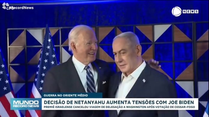 O premiê israelense, Benjamin Netanyahu , cancelou a viagem de uma delegação a Washington, capital dos EUA, onde seriam discutidas alternativas à operação terrestre na cidade de Rafa. A decisão foi tomada após os norte-americanos se absterem na votação do documento, apresentado segunda-feira (25) no Conselho de Segurança da ONU , que propunha um cessar-fogo no conflito contra o grupo terrorista Hamas. A medida foi aprovada com 14 votos, no entanto, autoridades de Israel esperavam que os Estados Unidos vetassem a resolução. O pronunciamento de Netanyahu surpreendeu a Casa Branca e foi visto como mais um ponto de tensão com o presidente Joe Biden.