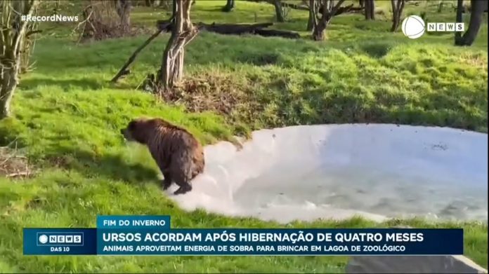 Os ursos marrons que vivem na Europa estão acordando de um sono de quatro meses , isso porque o inverno está chegando ao fim no hemisfério norte. Os animais estão aproveitando o fim do período gelado para se divertirem e gastarem a energia acumulada no período. Esses três animais vivem em um zoológico na Inglaterra.